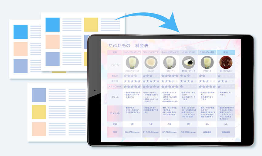 はい、自費補綴物(セラミック、ジルコニアなど)の種類や比較、患者への説明資料として活用できます。