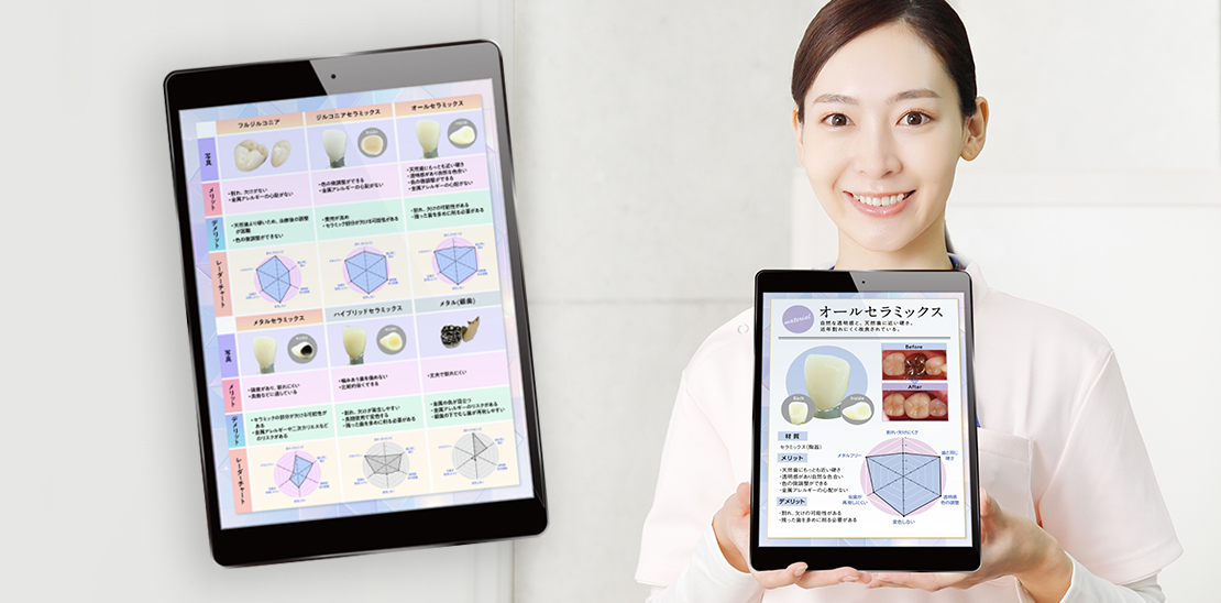 はい、自費補綴物(セラミック、ジルコニアなど)の種類や比較、患者への説明資料として活用できます。
