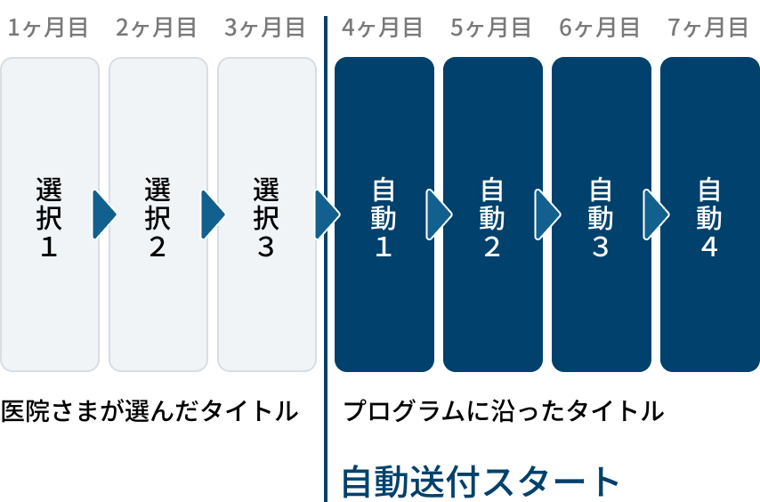 導入時にヒアリングをさせていただき、医院さまの患者層や診療方針に沿って配送プログラムを設定します。以降は毎月プログラムに沿ってAIが選定したタイトルが自動で届きます。プログラムはあとから自由に変更することができます。また、特定の月の発送タイトルを変更することも可能です。
